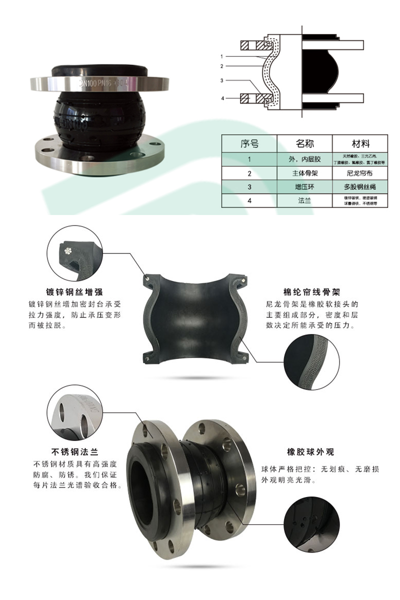 橡膠軟接頭一般由內(nèi)膠層、織物增強層(簾子布)、中膠層、外膠層、端部加固金屬環(huán)或鋼絲圈,經(jīng)高溫、高壓硫化成型后,與金屬法蘭或平行接頭松套組合而成的復合橡膠管,其使用壽命取決于簾子布的質(zhì)量。